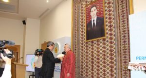 A.Kamilow dabaraly ýagdaýda gatnaşyjylaryň şowhunly el çarpyşmalary astynda däbe öwrülen türkmen donuny we ak telpegi geýýär. Şeýle hem myhmana degişli şahadatnamalar we nyşanlar gowşurylýar.