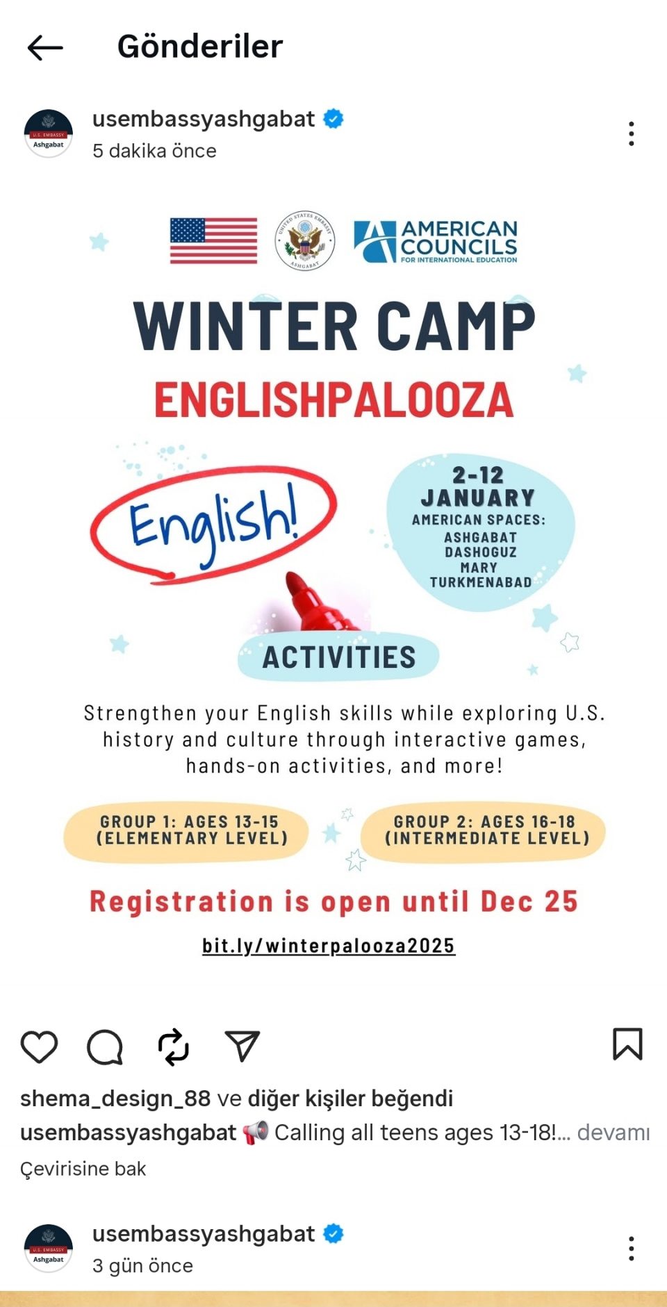 ABŞ-nyň Aşgabaddaky Ilçihanasy we “American Councils” guramasy tarapyndan guralýan Gyşky “EnglishPalooza” maksatnamasyna Türkmenistanyň dürli şäherlerinden ýaşlaryň bellige alynmagy başlandy.