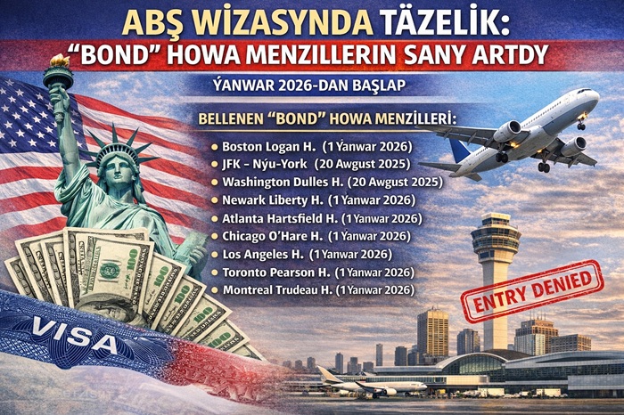 Öň habar berşimiz ýaly, ABŞ-nyň Döwlet departamenti tarapyndan kabul edilen täze karar esasynda, Türkmenistan raýatlaryny hem goşmak bilen birnäçe ýurduň raýatlary üçin “Visa Bond” (wiza üçin kepillik puly) talaby girizildi. Bu düzgün Türkmenistan raýatlary üçin 2026-njy ýylyň 1-nji ýanwaryndan başlap güýje girdi.