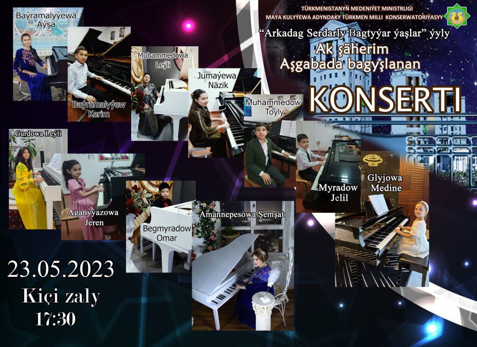 Konsertiň esasy aýratynlygy bolsa onda dürli mekdeplerden gelen dürli ýaşdaky okuwçylaryň we talyplaryň çykyş etmegidir. Olaryň ählisi hem Şemşat mugallymyň halypalyk etmeginde saz sungatynyň, fortepiano çalmagyň inçe syrlaryny öwrenýärler. Olaryň hatarynda  paýtagtymyzdaky dürli mekdeplerden gelen okuwçylar Jeren Aganyýazowanyň, Abdyjelil Myradowyň, Medine Gylyjowanyň, Aýşa we Abdykerim Baýramalyýewleriň, Leýli Gurdowanyň, Omar Begmyradowyň, Leýli Muhammedowanyň, Näzik Jumaýewanyň, Toýly Muhammedowyň atlaryny agzamak bolar. Bularyň iň körpesi – Medine Gylyjowa 6 ýaşynda bolup, 10 sany saz eserini ýerine ýetirdi we bäsleşik görnüşinde geçen konsertiň ýeňijisi boldy.