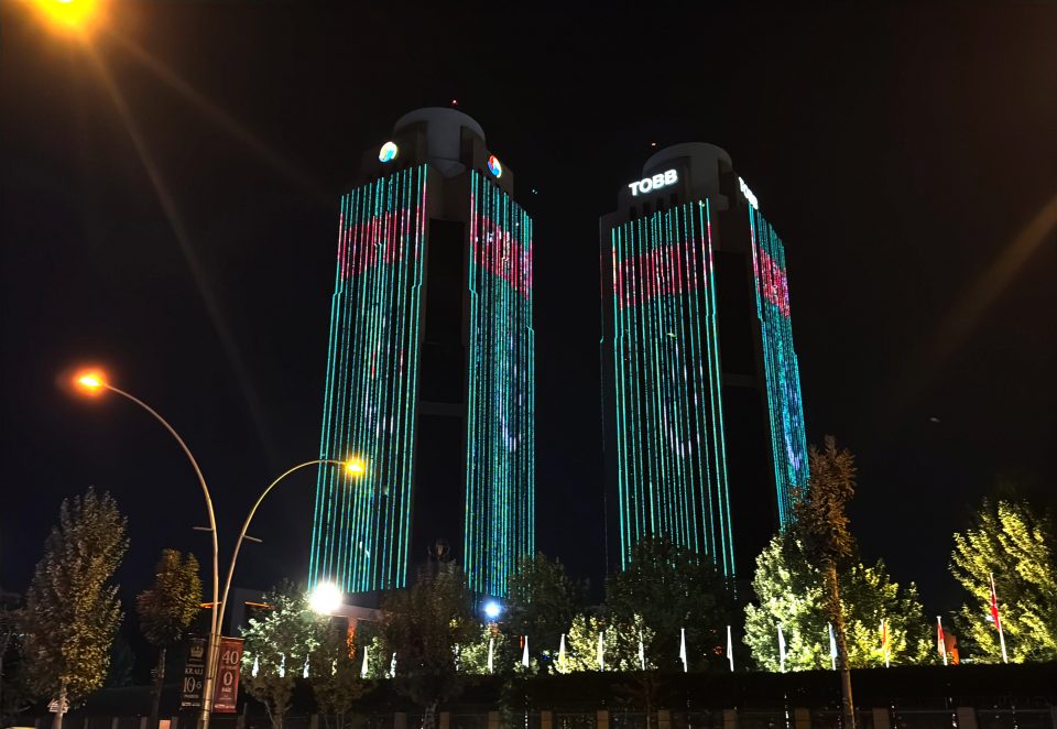 Haly gölli, ýarymaýly we bäş ýyldyzly gyzyl we ýaşyl baýdagynyñ aýdyñ çyra bezegi binalarda owadan şöhle saçdy. Türkiýeniñ söwda-senagat palatasy we birža birleşiginiñ binasynyñ beýikligi 140 m bolup, ol Ankaranyñ iñ beýik binalarynyñ biridigini we Türkiýe Respublikasynyñ möhüm işewür merkezidigini bellemek zerur.