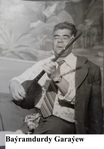 Ol mahallar obada ýaşaýardyk. 12-13 ýaşlarymdadym. Dynç alyş wagtymyz enemlere Gyzylarbada gezelenje giderdik. Goňşusy Bike daýza köplenç enemiň ýanyna gelerdi. Bir gezek gatyk eltip gelmek üçin enem meni Bike daýzalara ugratdy. Barsam öýlerinde Baýramdurdy Garaýew çaý içip otyr. Öýe gelemsoň, uly bir açyş eden ýaly: — Ene, Bike daýzalarda «Dosmämmet» aýdymy aýdýan bagşy otyr eken — diýdim welin, öýdäkiler hezil edip gülüşdiler. Şonda Bike daýzanyň Baýramdurdy aganyň aýalydygyny aýtdylar. Öňki Gyzylarbat «Garakölüçilik» sowhozynyň dükanynyň gapdalynda ýaşaýardylar.