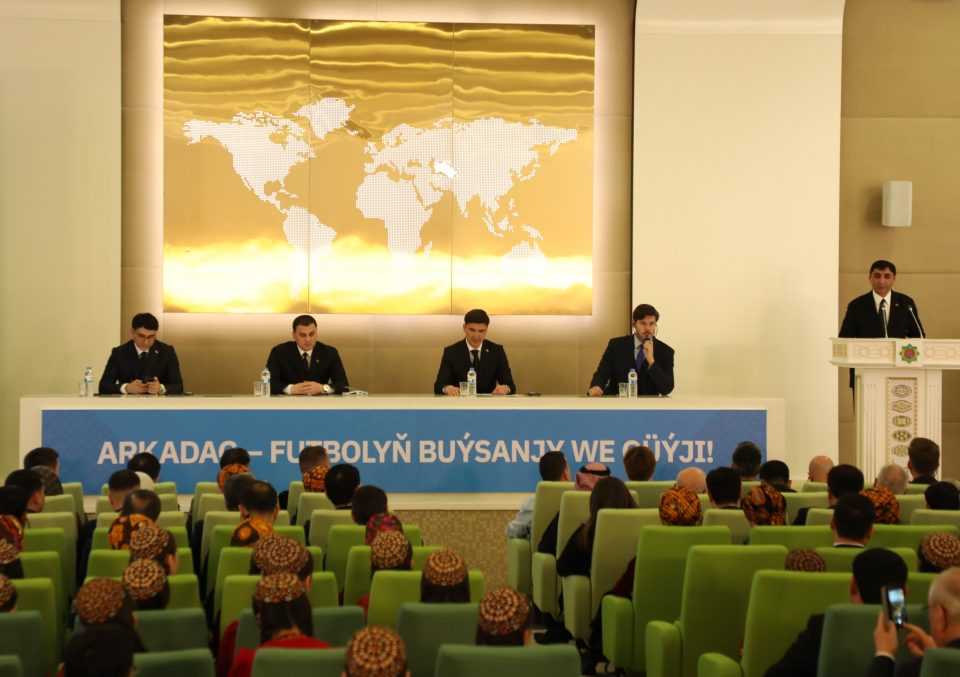 “Arkadag” futbol topary – türkmen futbolynyň buýsanjy we geljegi” atly metbugat maslahaty Olimpiýa şäherçesiniň Halkara ýaýlyma beriş merkezinde geçirildi.