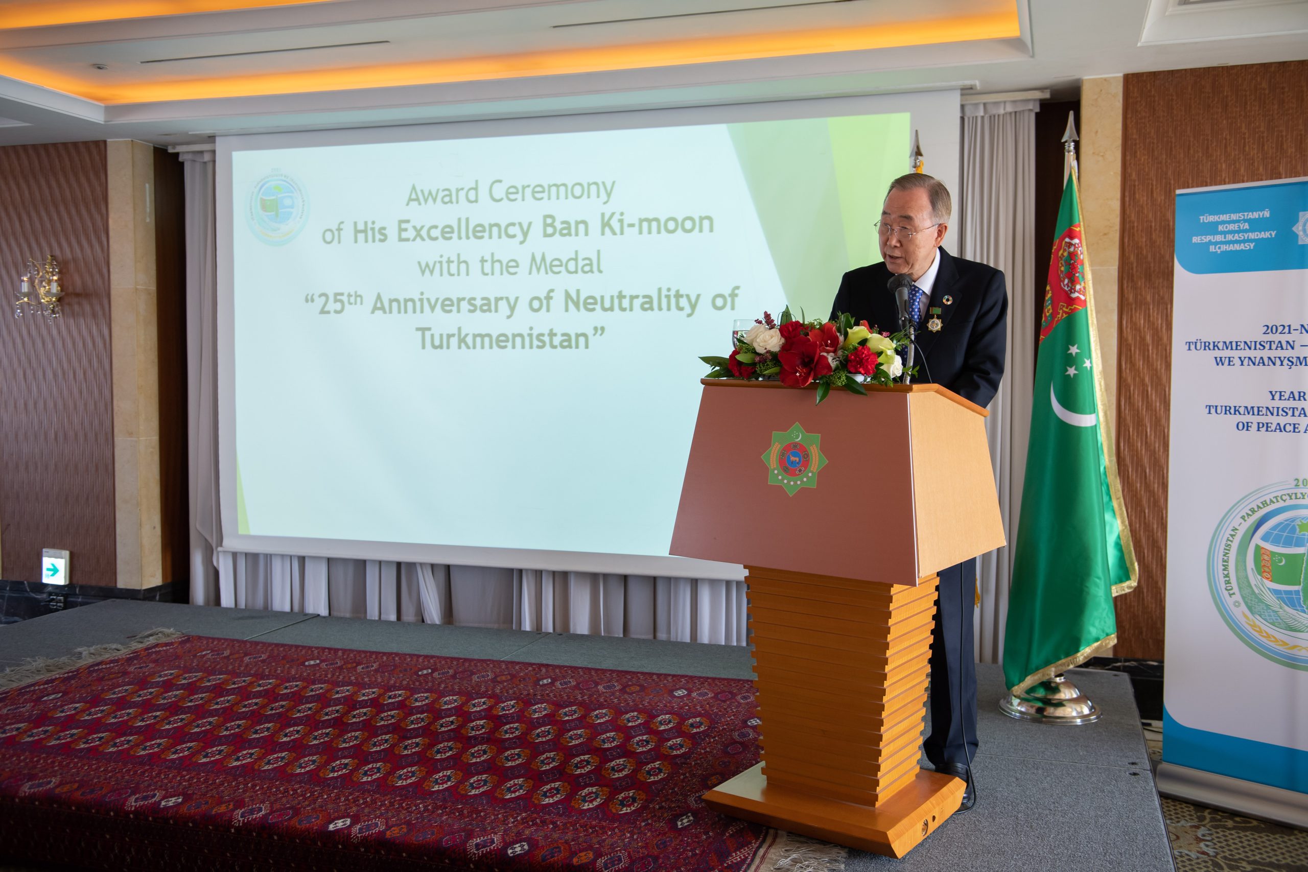 During the event the head of the Global Green Growth Institute Mr. Ban Ki-moon on behalf of the President of Turkmenistan Gurbanguly Berdimuhamedov was awarded the jubilee medal “25th Anniversary of the Neutrality of Turkmenistan”. Mr. Ban Ki-moon in his speech expressed the words of gratitude to the Leader of Turkmenistan and noted that Turkmenistan pays great attention to the cooperation with international organizations, particularly the UN.