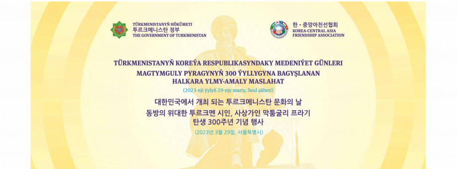 Within the framework of the Culture Days of Turkmenistan in the Republic of Korea, an international conference, dedicated to the 300th anniversary of birth of the great thinker and classical poet of the East Magtymguly Pyragy, as well as the exhibitions and joint friendship concert of Turkmen-Korean artists and performers will be organized. The screening of the Turkmen films will also take place.