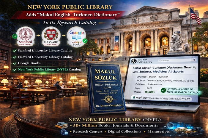 The Turkmen-language dictionary titled “Makul English–Turkmen Dictionary: General, Law, Business, Medicine, AI, Sports” has been officially included in the research catalog of the New York Public Library (NYPL), one of the most prestigious libraries in the world.