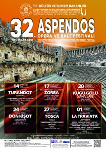 Antalýada yerleşýän Aspendos gadymy teatrynda 14-nji sentýabrda «Aspendos» atly 32-nji halkara opera we balet festiwalynyñ açylyşy boldy. Festiwal Jakomo Puççiniñ «Turandot» – buzly hytaý şazadasy ertekisini ýerine ýetirýän opera sungatynyň ussatlarynyñ çykyşy bilen açyldy.2000 ýyllyk taryhy bolan ajaýyp akustikasy bilen tanalýan bu teatrda dünýä belli tenor Rikkardo Massi (Italiýa) şeýle hem soprano Olga Maslowa (Russiýa) çykyş ederler.Aspendosda geçirilýän bu festiwalda 17-nji sentýabrda «Zorba» baleti, 20-nji sentýabrda «Guw köli», 24-nji sentýabrda «Don Kihot» we 27-nji sentýabrda «Toska» operalary ýerine ýetiriler.Festiwal 1-nji oktýabrda Juzepe Werdiniñ «La Trawiata» operasynyñ Özbegistanyň Alişer Nowaýy adyndaky Döwlet akademiki Uly opera we balet teatry tarapyndan ýerine ýetirilmegi bilen tamamlanar.