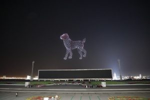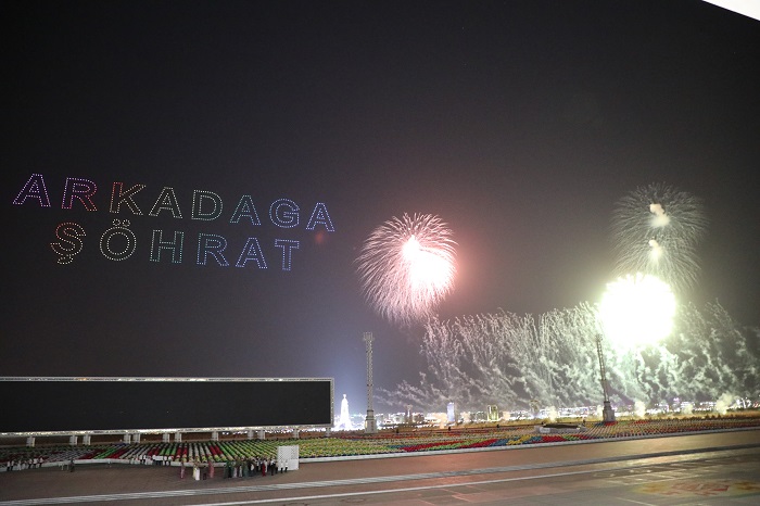 Bu ýerde lazer şüweleňi bilen Döwlet münberiniň asman giňişliginde “Türkmenistan” ýazgysy, Garaşsyzlyk binasynyň, ahalteke bedewiniň, türkmen alabaýynyň, ýurdumyzyň Garaşsyzlygyny 30 ýyllygyny alamatlandyrýan “30” ýazgy, düýeli kerwen ýoly ýaly ajaýyp pursatlar emele geldi.