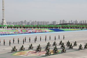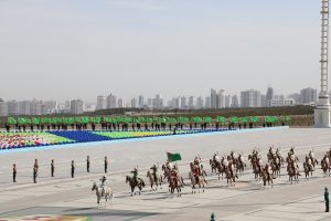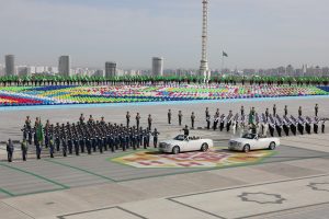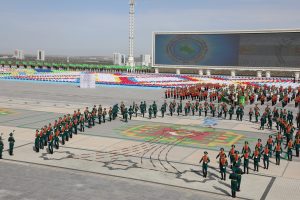 Döwlet münberiniň toplumynyň öňündäki meýdançasynda bu şanly senä bagyşlanan harby ýörişde türkmen Watan goragçylarynyň ýokary hünär ussatlygyny nobatdaky gezek görkezdi. Harby we hukuk goraýjy edaralarynyň şahsy düzümi ýöriş ussatlygyny, harby tehnikalaryň we ýaraglaryň nusgalaryny görkezdiler.