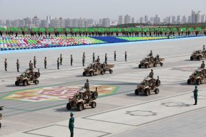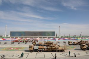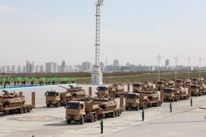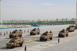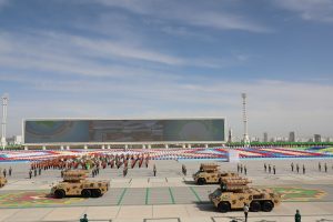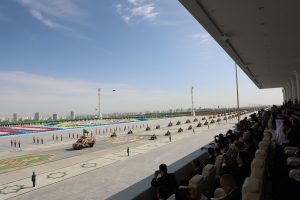 Münberiň öňündäki meýdançadan goşunlaryň dürli kysymlaryna degişli bolan harby tehnikalar geçip gitdiler. Şu dabaraly harby ýörişde “BMC Kirpi MRAP” kysymly sowutlanan harby awtoulaglar hem görkezildi.