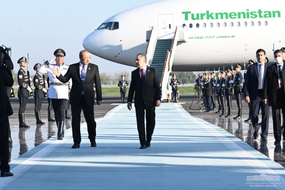 Samarkantyň halkara howa menzilinde Türkmenistanyň Milli Geňeşiniň Halk Maslahatynyň Başlygy Gurbanguly Berdimuhamedowy Özbegistan Respublikasynyň Premýer-ministri Abdulla Aripow we beýleki resmi adamlar garşylady.