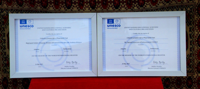 Türkmenistana Magtymguly Pyragynyň golýazmalar toplumynyň “Dünýäniň hakydasy” maksatnamasynyň halkara sanawyna girizilendigi barada şahadatnamalar dabaraly ýagdaýda gowşuryldy. Bu barada Halkara habarlar merkezi habar berýär.