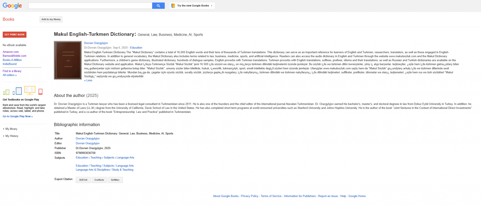 Dünýäniň iň uly sanly kitap kataloglarynyň biri bolan “Google Books” ulgamyna giň göwrümli “Makul English–Turkmen Dictionary” (Makul Iňlis–Türkmen sözlügi) girizildi. Bu sözlügiň “Google Books”-da ýerleşdirilmegi onuň diňe bir Amazon arkaly elýeter däldigini, eýsem halkara derejesinde resmi ISBN ýazgysy bilen tanalyp, dünýäniň dürli künjeginden alymlara, talyplara hem-de giň okyjy köpçüligine elýeterli bolandygyny görkezýär. Kitap barada “Makul sözlük” … Continue reading “Makul sözlük” indi Google Books katalogynda!