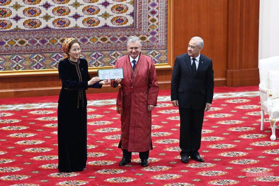 Soňra Türkmenistanyň Ýokary attestasiýa komitetiniň Özbegistan Respublikasynyň Prezidenti Şawkat Mirziýoýewe «Magtymguly adyndaky Türkmen döwlet uniwersitetiniň Hormatly professory» alymlyk adyny dakmak baradaky çözgüdi yglan edildi. Dostlukly ýurduň Liderine bu ýokary alymlyk derejesi onuň türkmen we özbek halkarynyň arasynda däp bolan dostluk, doganlyk hem-de hoşniýetli goňşuçylyk gatnaşyklarynyň, syýasy, söwda-ykdysady, ýangyç-energetika, ulag kommunikasiýa, ylym-bilim, medeni-ynsanperwer, sport we syýahatçylyk ulgamlaryna netijeli döwletara hyzmatdaşlygyň pugtalandyrylmagy hem-de giňeldilmegi ugrunda bitiren şahsy hyzmatlary we uly goşandy üçin berildi.