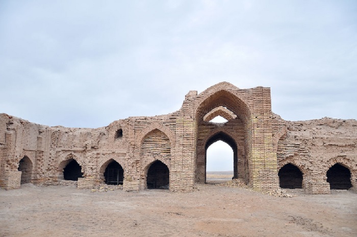 Ещё одна особенность памятника в том, что это единственный памятник в Центральной Азии, отличающийся по высоте входа и стен коридоров. В правой стороне от входа была расположена комната для мечети. Предполагается, что вокруг были расположены мастерские и лавки различных ремесленников. Внешние стены караван-сарая прямоугольные, из сырого кирпича, расстояние от угла – до угла превышало 100 метров. Внутренний двор имел квадратную форму, каждая сторона которого равнялась 53 метрам, тоже из сырцового кирпича. У караван-сарая были выходы в стороны Мерва и Хорезма. Внутренняя часть центра караван- сарая выполнена также из сырцового кирпича, и тоже квадратной формы.