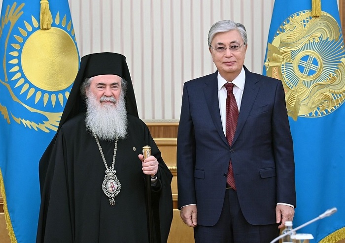 В резиденции Акорда 13 сентября состоялась встреча главы Казахстана Касым-Жомарт Токаева с Патриархом Иерусалимским Феофилом III. Политик и священослужитель обсудили векторы актуального развития межрелигиозных и межконфессиональных связей и конструктивного сближения. Об этом CentralAsia.news сообщили в пресс-службе Акорды.