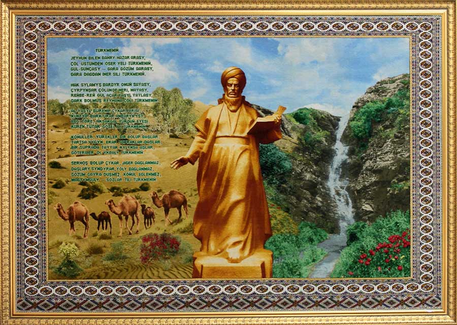 Удачный портрет поэта выполнен в ковре с большой плотностью нитей. На заднем плане — увеличенное перо в стилизованном варианте, на переднем – реалистический портрет Махтумкули. Автор этой работы со вкусом подобрал цвета с палевыми оттенками. Ковер отличает исключительно аккуратное исполнение.