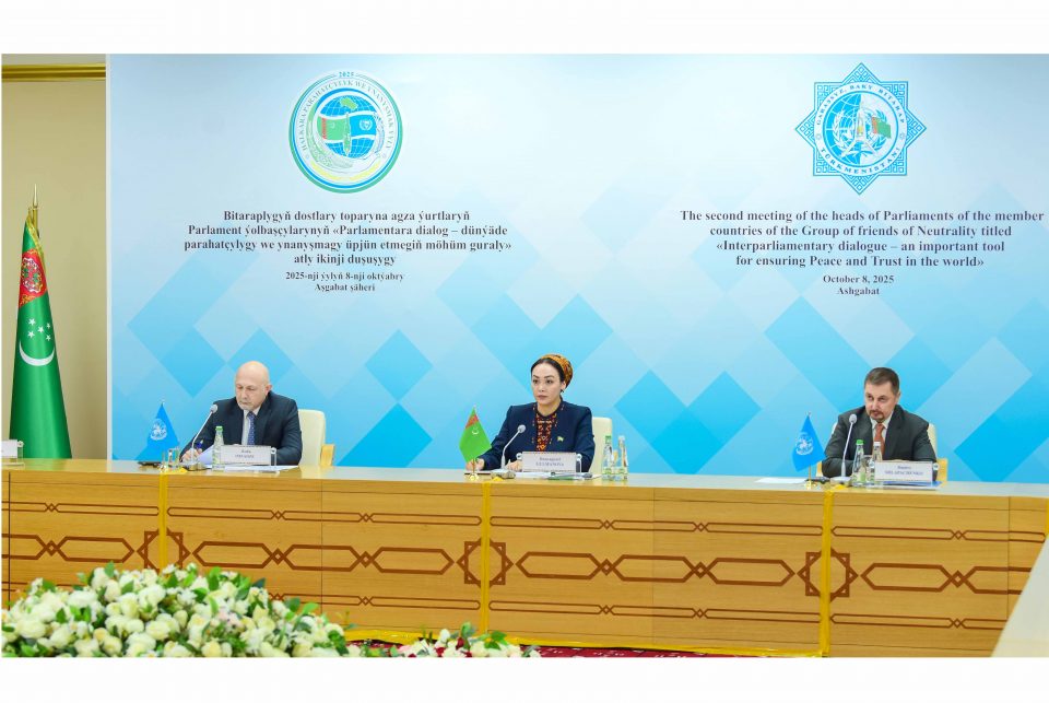 8 октября 2025 года в Меджлисе Туркменистана прошла вторая встреча спикеров парламентов стран-членов Группы друзей нейтралитета под названием «Межпарламентский диалог – важный инструмент обеспечения глобального мира и доверия». Мероприятие, организованное в гибридном формате, прошло под председательством спикера Парламента Туркменистана Дуньягозель Гульмановой и собрало руководителей законодательных органов стран-членов Группы, представителей Межпарламентского союза, Совета межпарламентской ассамблеи СНГ, а также агентств ООН в Туркменистане, включая Региональный центр ООН по превентивной дипломатии для Центральной Азии.