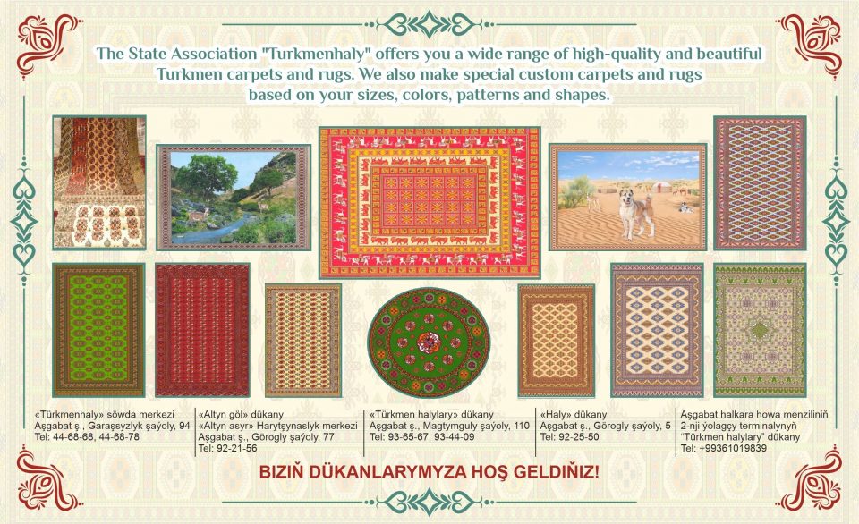 • Магазин «Türkmen halylary», г. Ашхабад. проспект Махтумкули, 110. Телефон: 93-65-67; 93-44-09;