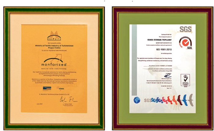 Новому текстильному комплексу также был вручён сертификат OEKOTEX STANDARD 100, подтверждающий безопасность и отсутствие вредных химических веществ на любом этапе производственного процесса, что является дополнительным показателем качества продукции.