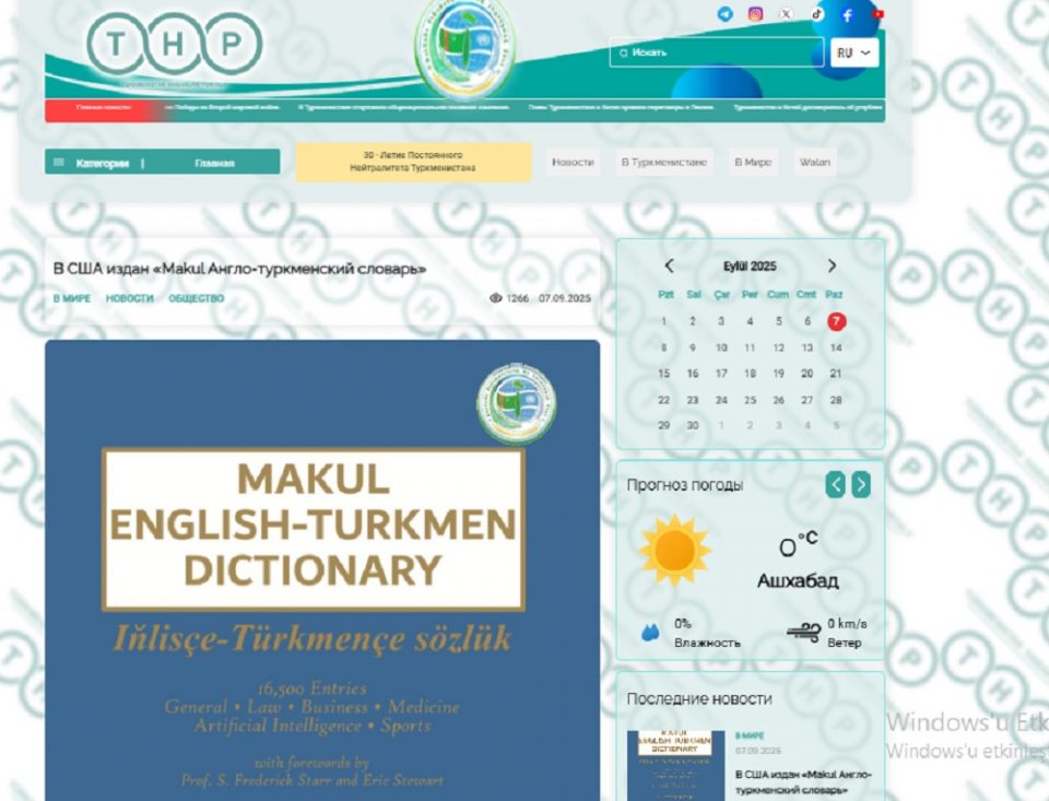 Türkmenistanyň Garaşsyzlygynyň şanly 34 ýyllygyna hem-de hemişelik Bitaraplygymyzyň ýubileý 30 ýyllygyna gabatlanyp, ABŞ-da neşir edilen “Makul iňlisçe–türkmençe” sözlük baradaky habarlar türkmen metbugatynda neşir edilip başlandy.
