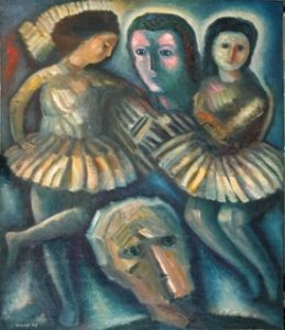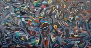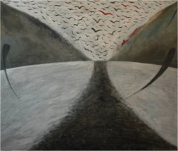 «Ata-babalarymyz» (Hudožnik bu işimde biz kim we nireden gelýäris. Gara reňkiň üsti bilen hudožnik ata-babalarymyzyň öten dünýäsini tragiki şekilde görkezýär).