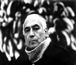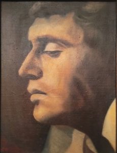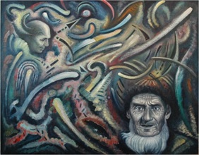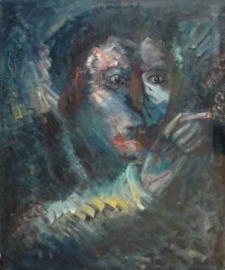 «Şahyr». (Hudožnik bu işinde şahyryň dünýäsini garamtyl reňkleriň ylaýtada ýaşyl reňkiň üsti bilen geçen günlere, ýatlamalara alyp gidýär).