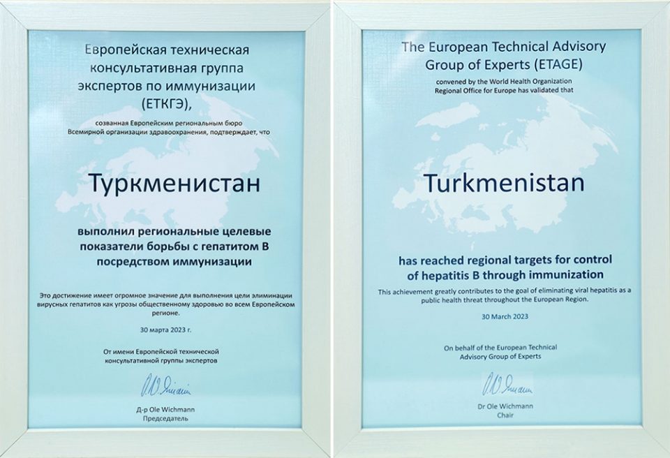 Bu Sertifika, Türkmenistan’ın aşılama yoluyla hepatit B ile mücadelede bölgesel hedeflere ulaştığını doğrulamaktadır. Belgede, bu başarının, Avrupa Bölgesi genelinde halk sağlığı tehdidi olan viral hepatitin ortadan kaldırılması hedefine ulaşmak için büyük önem taşıdığı belirtiliyor.