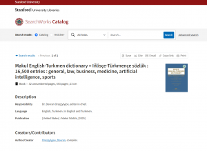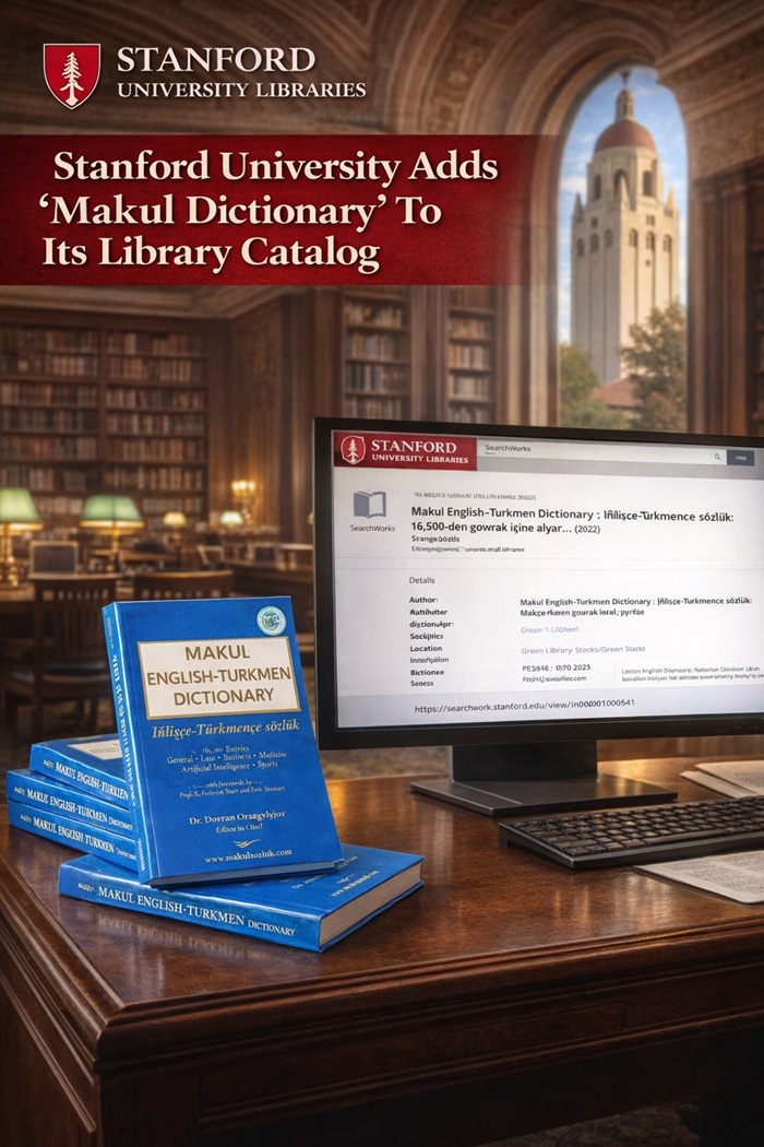 “Makul English–Turkmen Dictionary: General, Law, Business, Medicine, AI, Sports” adlı eser, dünyanın en prestijli yükseköğretim kurumlarından biri olan Stanford Üniversitesi kütüphane sisteminin resmi kataloğuna eklenmiştir.