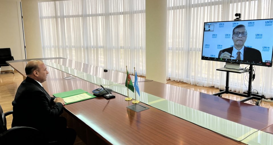 Belge, Türkmenistan Çevre Koruma Bakanı Çarygeldi Babaniyazov ve BM UNEP Kurumu yetkilisi Aggarwal-Khan arasında çevrimiçi olarak imzalandı.