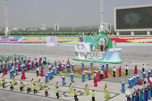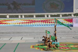 Askeri geçit törenindne sonra ülkenin sektörlerin geçit töreni yapıldı. Bu tören öncesinde Türkmenistan Devlet Başkanı’na Dowamat isimli ahalteke atı hediye edildi