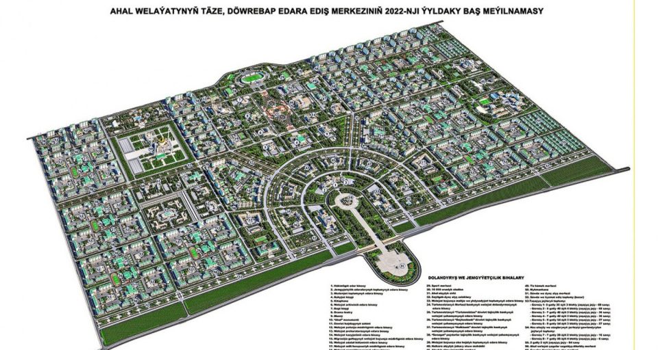 Ahal vilayetinin yeni modern idari merkezinin valisi Şamuhammet Durdılıyev’in verdiği bilgilere göre, toplam 1002 hektarlık alanda dev bir kent kuruluyor.