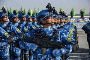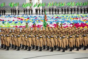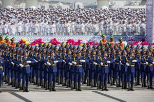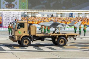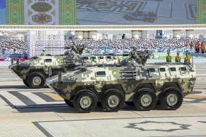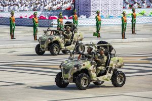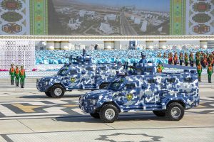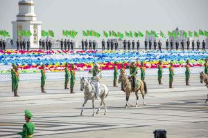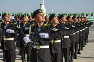 Soňra baýramçylyk dabaralary Döwlet münberiniň toplumynyň öňündäki meýdançasynda dowam etdirildi. Bu ýerde ilki bilen, dabaraly harby ýöriş geçirildi. Harby ýörişde döwlet Garaşsyzlygynyň şanly 34 ýyllygy mynasybetli ýurdumyzyň goranyş kuwwaty görkezildi.