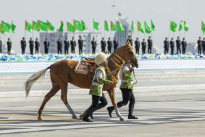 Bu ýerde milli lybasdaky iki çapyksuwar ajaýyp ahalteke bedewini meýdança çykardylar. Şaý-sepler bilen bezelen at esbaplary behişdi bedewiň gözelligine gözellik goşýar. 2022-nji ýylda doglan Zaman atly akýal mele reňkli bu ajaýyp bedew Gurthatar we Yşgyn diýen atlaryň neslindendir. Ady rowaýata öwrülen Gelşikliniň ugruna degişli bolan bu bedew Türkmenistanyň Garaşsyzlygynyň 34 ýyllygy mynasybetli, türkmen halkynyň bagtyýarlygy, Watanymyzyň mundan beýläk-de gülläp ösmegi ugrunda edýän yzygiderli aladasy üçin tüýs ýürekden hoşallygyň nyşany hökmünde Hökümet agzalarynyň adyndan hormatly Prezidentimiz Serdar Berdimuhamedowa sowgat berildi.