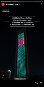 Şeýle ajaýyp wakalaryň ýene-de biri Birleşen Arap Emirlikleriniň Abu-Dabi şäherinde hem bolup geçdi. Bu şäherdäki “ADNOC” milli nebit kompaniýasynyň binasy türkmen baýdagy bilen bezeldi.