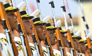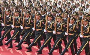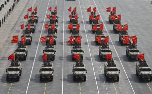 Soňra bu meýdanda dabaraly harby ýöriş geçirildi. Dabara 70 minut dowam etdi. Şol döwürde Hytaýyň milli goşun gulluklary dünýä derejesindäki tehnologiýalar we mümkinçilikler bilen enjamlaşdyrylan täze harby enjamlaryny görkezdi. Çärelerde söweş tanklarynyň täze görnüşleri, harby uçarlar, söweş uçarlary we strategiki raketalar görkezildi. Şeýle hem dabarada uçarmansyz uçarlar hem-de tehnikalar görkezildi.