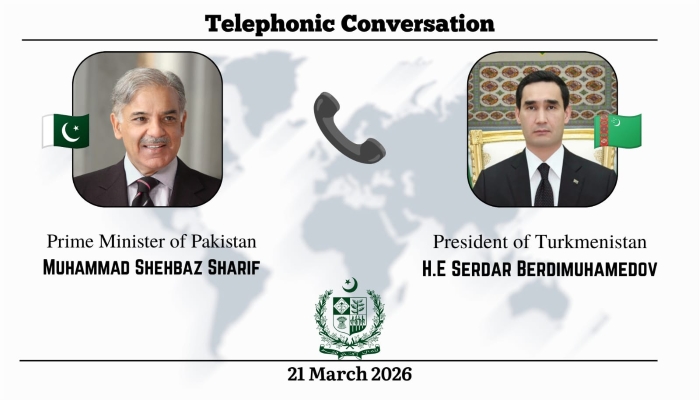 Türkmenistanyň Prezidenti Serdar Berdimuhamedow we Pakistanyň Premýer-ministri Muhammet Şahbaz Şarif 2026-njy ýylyň 21-nji martynda Oraza baýramy mynasybetli telefon arkaly söhbetdeşlik geçirdiler diýip, Premýer-ministriň edarasy habar berýär.