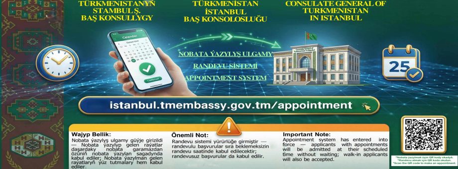 Türkmenistanyň Stambul ş. Baş Konsullygy, raýatlara hödürleýän hyzmatynyň hilini ýokarlandyrmak maksady bilen nobata ýazylyş ulgamyny işe girizdi. Bu barada konsullyk edarasynyň resmi saýtynda habar berilýär.