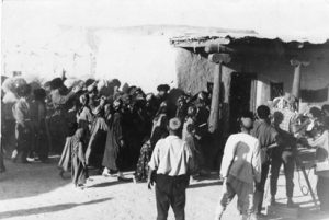 “Keçpelek”filmini döredijiler. Ortada dik duran gara könekli Ö. Kulyýew.