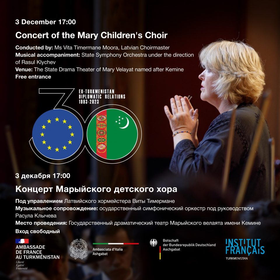 Ýewropa Bileleşiginiň Türkmenistandaky wekilhanasy Mary welaýatynyň we Mary şäheriniň ýaşaýjylaryny 3-nji dekabrda sagat 17:00-da Kemine adyndaky Döwlet drama teatrynda geçiriljek Mary welaýatynyň Mollanepes adyndaky sungat mekdebiniň çagalaryň hor toparynyň konsertine gatnaşmaga çagyrýar.